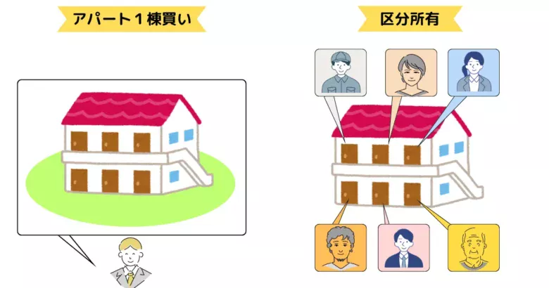 区分所有が「マンションの1室」を所有して運用するのに対し、1棟買いは「建物全体と土地」を所有します。